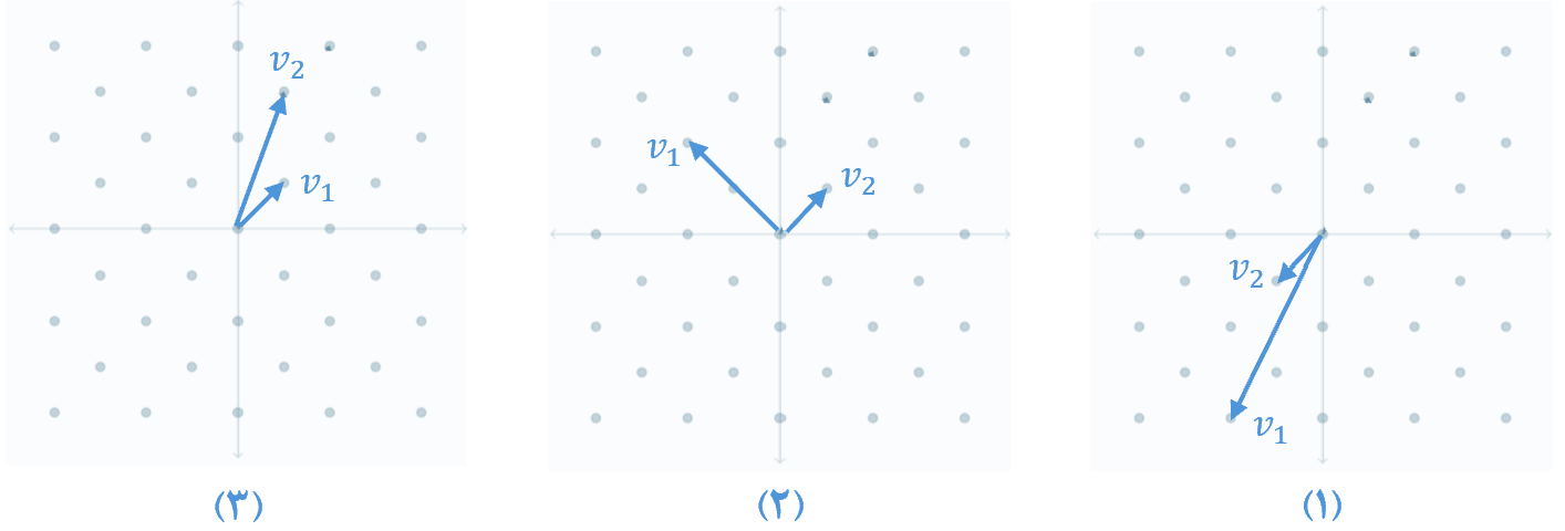 به بیان سادهتر، با الگوریتم کاهش LLL ما به دنبال این هستیم که بجای پایه B، پایهای برای یک مشبکه پیدا کنیم که بردارهایی متعامدتر(زاویه نزدیکتر به ۹۰ درجه بین بردارها)، هماندازهتر و کوتاهتر داشته باشد. همانطور که در شکل زیر نشان دادم یک مشبکه دو بٌعدی با بردارهای پایه بد بعد از اعمال الگوریتم LLL، آنها را به بردارهای متعامد خوب مشبکه کاهش میدهد.