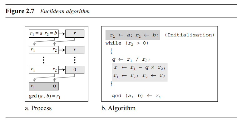 الگوریتم اقلیدسی بر این اصل استوار است که GCD دو عدد تغییر نمیکند اگر عدد بزرگتر با اختلاف آن با عدد کوچکتر جایگزین شود. این فرایند تکرار میشود تا باقیمانده صفر شود، در این مرحله مقسومعلیه غیرصفر GCD جفت اصلی اعداد است.
